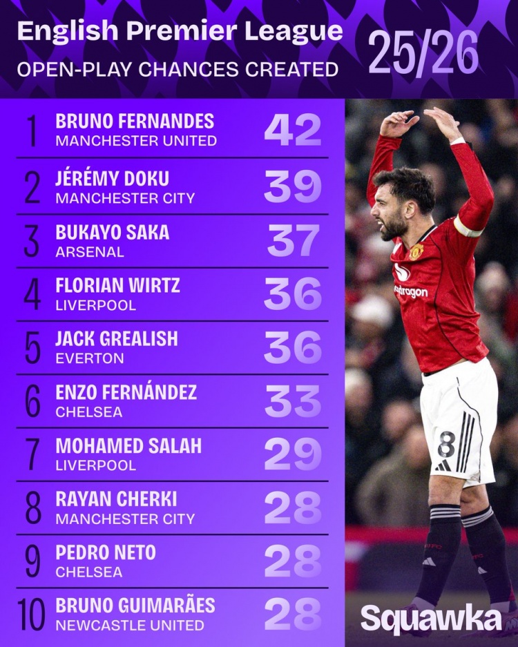 本赛季英超运动战创造机会次数:B费42次第一,多库萨卡二三位