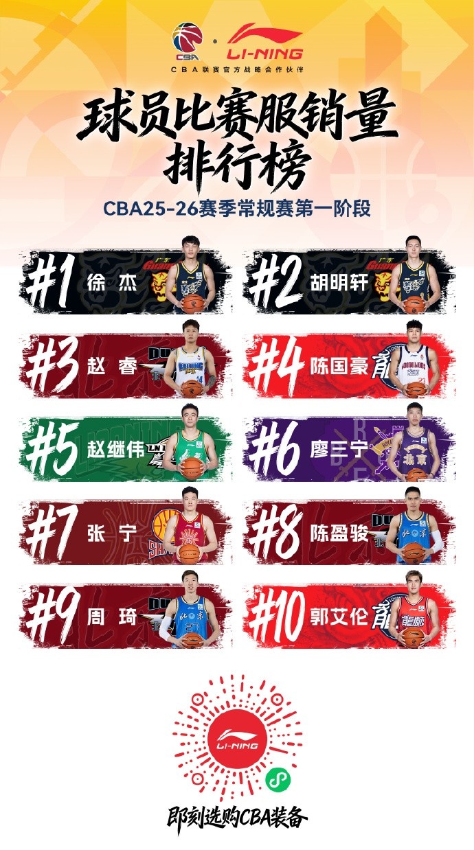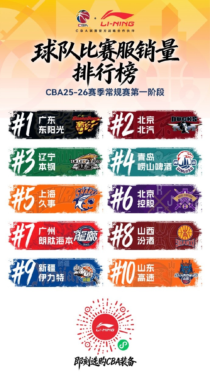 2月7日讯 今天,李宁公布了常规赛第一阶段球员球衣销量TOP10以及球队球衣销量TOP10。